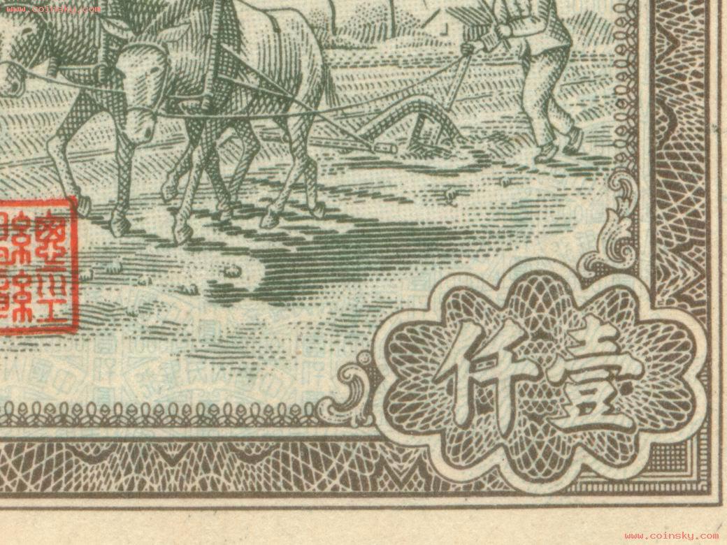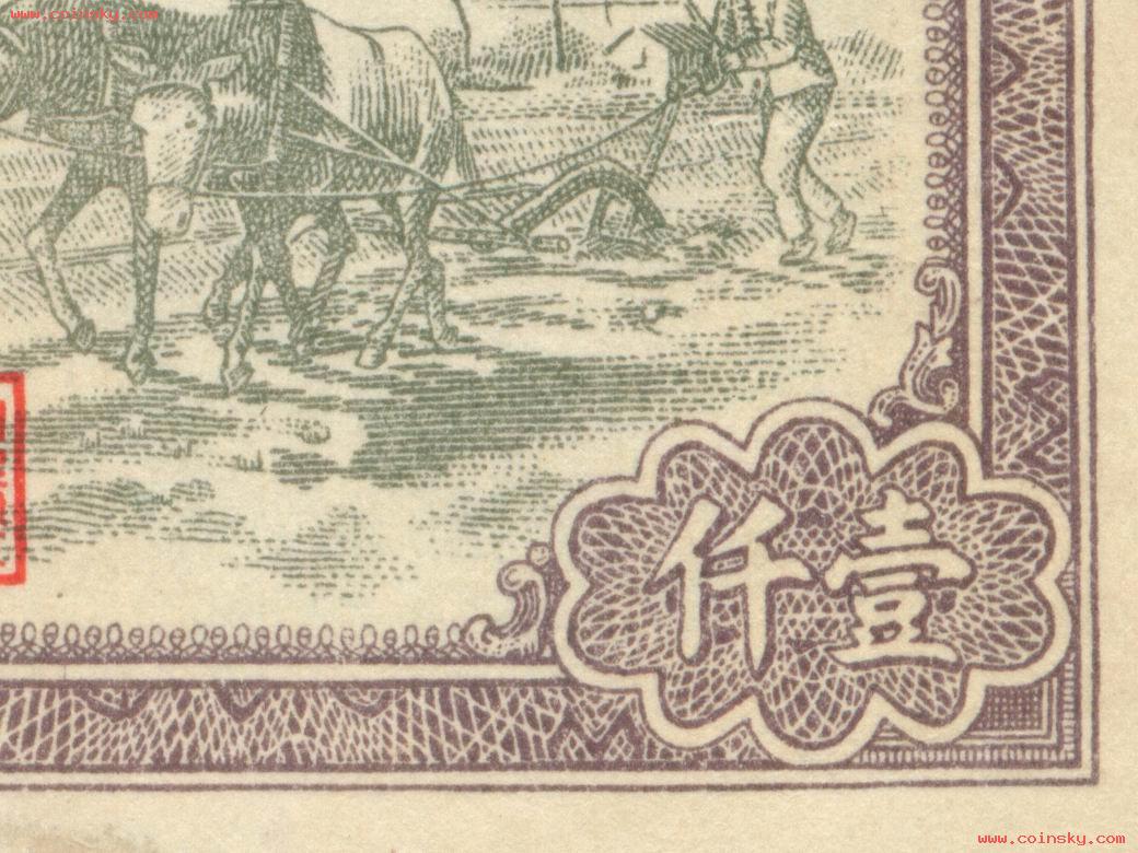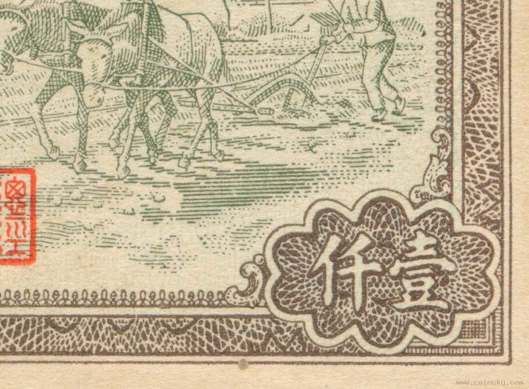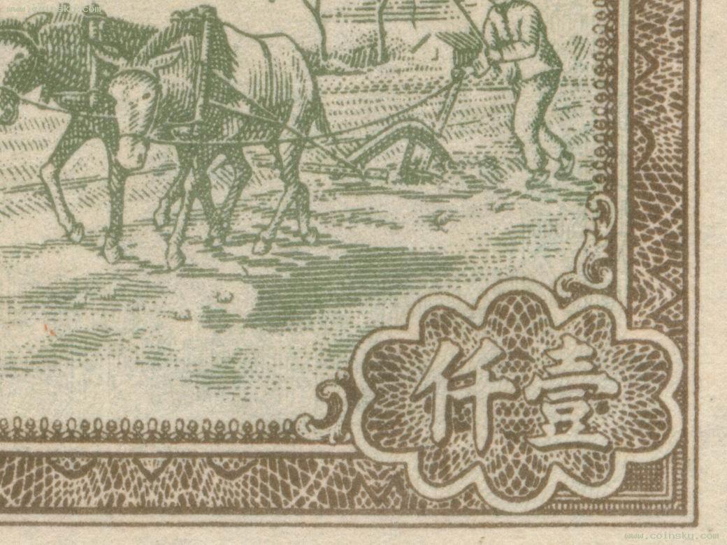 第一版人民币1000元推车耕地真假对照图(新假)