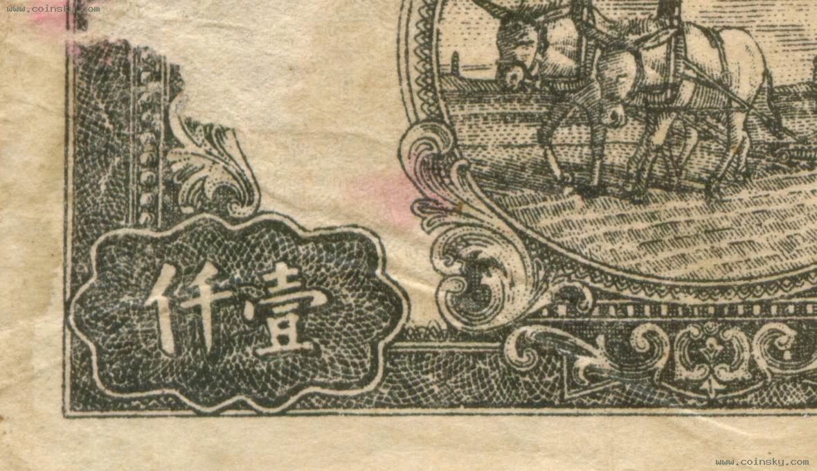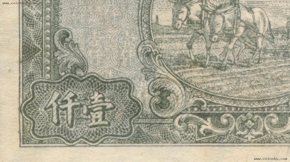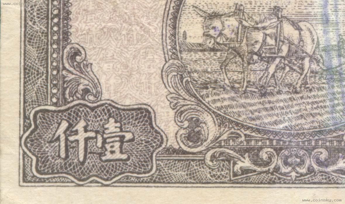 壹仟圆(七位数)狭长型双马耕地真假局部对照图(四):A:为真票;B:为版式一的老假票,C:为版式二的老假票,D:为版式三的老假票。 A:B:C:D: