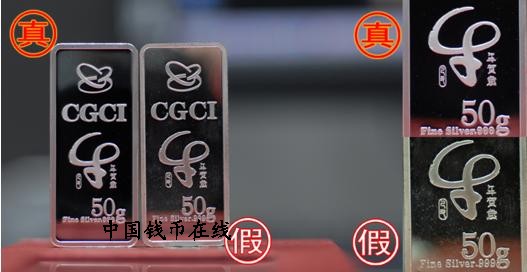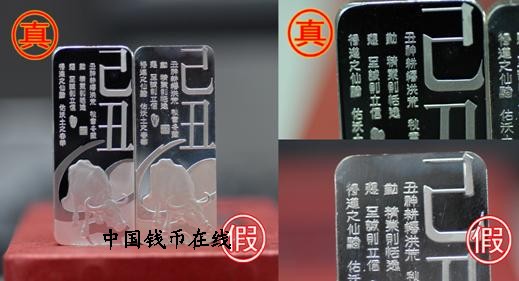 近日,我公司在上海市场上发现牛年贺岁银条50克的赝品,市场售价低于正品约40%。经有关专业人士鉴定,赝品无论是在图案、重量,还是在铸造工艺、质感等方面,已近乱真,仅在“鉴定证书”、“包装盒”及“保险卡”等方面与正品有较为明显的差异,因此赝品极具欺骗性和危害性。