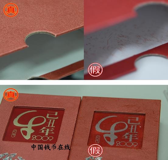 ( 1)正品包装盒外屉内部没有纸张脱色所留下的红色印记,而赝品由于纸张粗糙而脱色,留下了红色的印记;( 2)正品盒面“己丑牛年”字体颜色为暗黄色,赝品为银灰色;( 3)正品包装盒内有紫色丝带,赝品没有;