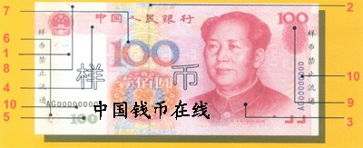 7. 雕刻凹版印刷 8. 红、蓝彩色纤维 9. 隐形面额数字 10. 横竖双号码