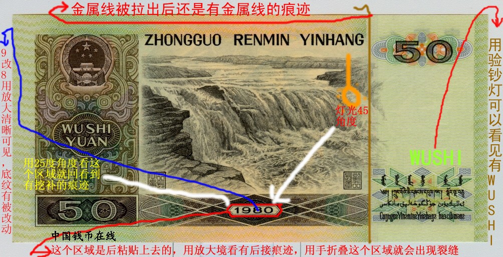 以下是在真的1980年版50元图解示意希望大家能看的明白,希望大家多提供有价值的线索让造假者无用武之地,