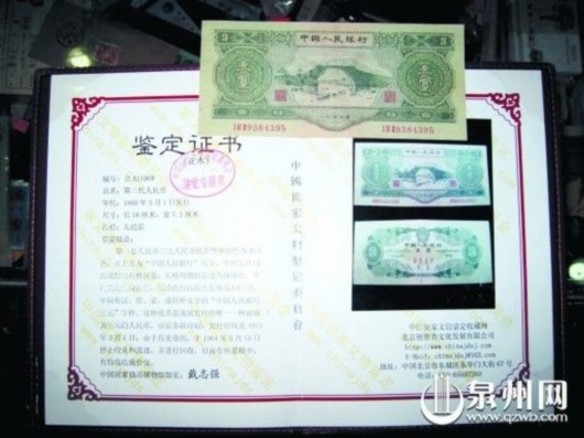 鉴宝专家的这一结论可把游先生给“打”晕了。这一张1953年版面额叁圆的人民币,游先生是今年5月份刚刚以6000元从厦门钱币商人兰先生手中买来的。游先生称,他当时购买这一张1953年版面额叁圆的人民币时,同时还有一份《鉴定证书》,出具这份证书的是中国国家钱币博物馆馆长戴志强。因此,游先生还随身携带来那份《鉴定证书》,不过,王立军随后的一席话让他更加沮丧:“纸币是假的,鉴定证书也是假的。”