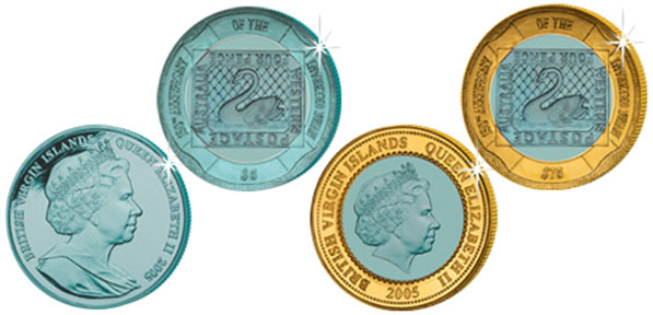 两枚名为“倒置的天鹅”的硬币均为英属维尔京群岛的法定货币。面额5美元的硬币由绿松色钛铸成,而面额75美元的硬币的外圈是成色999.9的黄金,中心是绿松色的钛。