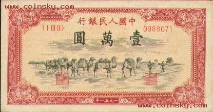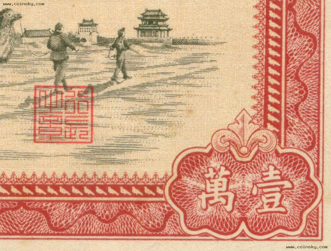 第一版人民币100000元骆驼队真假对照图(新假)