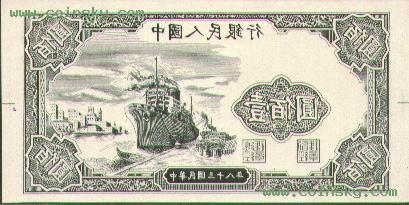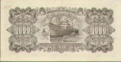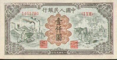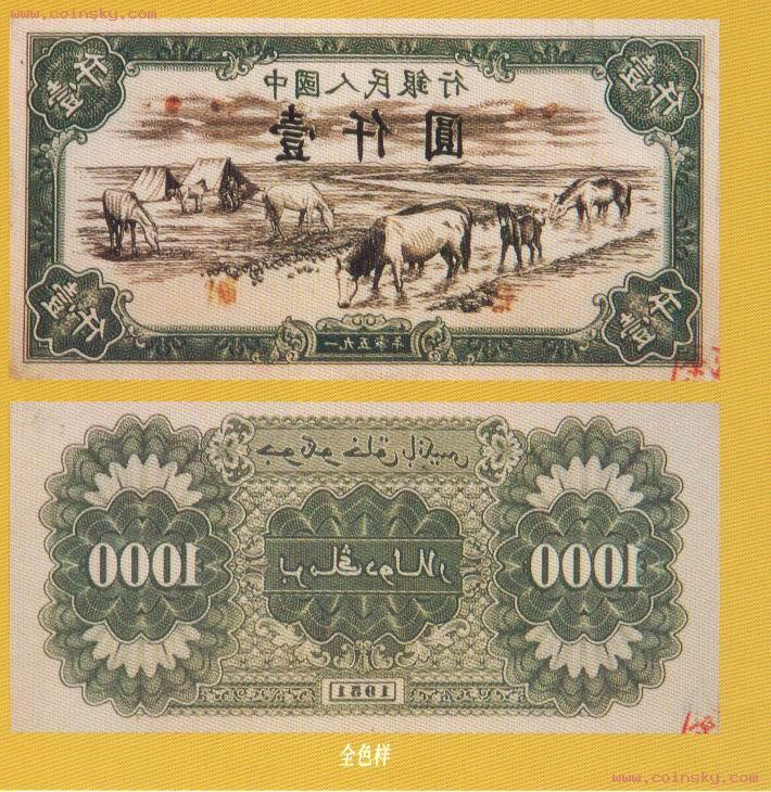 在1988年中国人民银行货币发行司编的<人民币图册>第161页附录了1949年12月23日中国人民银行总行的通报,内容如下:「…本行发行“推车”图景仟元券一种。兹将票券式样说明如下:正面:底纹为浅蓝色,中间花符为红茶色,花边为葡萄紫色。…左方为“推车”图景,左上方有七位阿拉伯号码;右方为“农人耕地”图景,右上方有三位罗马字字头,…背面:图景及花符为浅蓝色…」。 我想探讨的是这个通报对于正面左右图景的颜色没有提出说明,漏掉了;因而此券印制工艺在所有书籍的资料都是胶印四色,而不是胶印五色;(1)或许有人会说花边和图景是同一个颜色,那么壹佰圆蓝北海与角楼的花边和图景又怎么解释?蓝北海与角楼的胶印五色又怎么算?我们可以确定的是花边和图景绝对属于不同版;(2)也有人认为正面的底纹为浅蓝色,而背面的图景及花符也是浅蓝色,这是从字面上一字不漏,完全不加以思索的引述,正面底纹和背面的图景、花符一眼就认出是不同色,事实上背面的颜色根本不是浅蓝色,倒是和正面花边所谓葡萄紫色比较像,但这个问题我在上面第1161楼已经阐述过,不再赘言了;所以,如果第一套人民币的印制工艺确实都是以印版来分而不以颜色来计算的话,那么本券就应该是胶印五色方为正确。(注:战争时期,任何不可能的事都会变成可能;同样地,认为理所当然的事或许也未必然,譬如这个通告的内容竟然也会有部分的错误。)