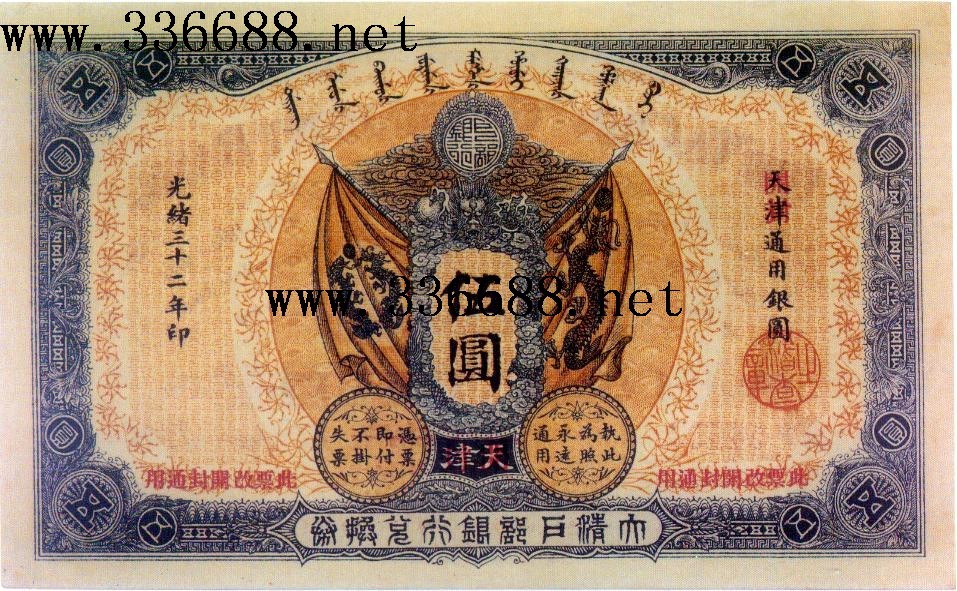 大清光绪31年 <1905年>清政府为调节国用盈虚和整理币制,成立了(大清户部银行)行使国家银行的职能,发行银两,银圆兑换券,银圆兑换券面值有壹圆、伍圆、拾圆三重。地名包括北京、天津、天津改开封、张家口改云南、汉口、济南等~~