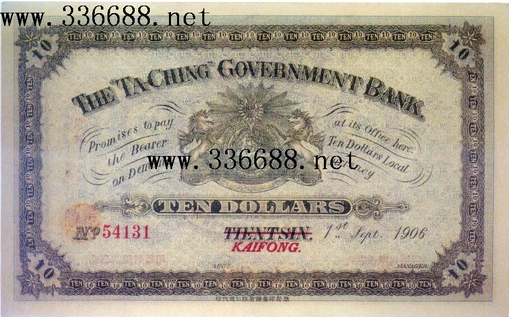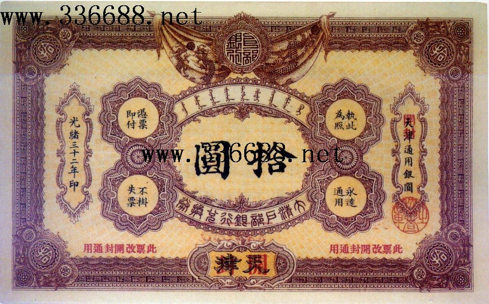 大清光绪31年 <1905年>清政府为调节国用盈虚和整理币制,成立了(大清户部银行)行使国家银行的职能,发行银两,银圆兑换券,银圆兑换券面值有壹圆、伍圆、拾圆三重。地名包括北京、天津、天津改开封、张家口改云南、汉口、济南等~~