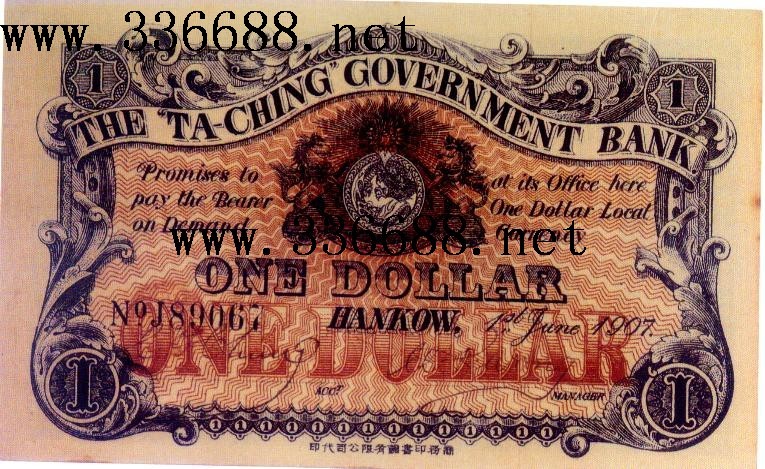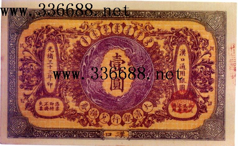 大清光绪31年 <1905年>清政府为调节国用盈虚和整理币制,成立了(大清户部银行)行使国家银行的职能,发行银两,银圆兑换券,银圆兑换券面值有壹圆、伍圆、拾圆三重。地名包括北京、天津、天津改开封、张家口改云南、汉口、济南等~~
