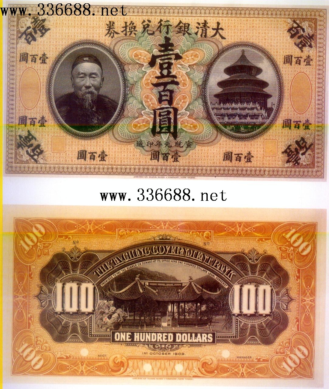 宣统元年 《1909年》大清银行发行银圆兑换券、图案以李鸿章及风景为主、面值有壹圆、伍圆、拾圆、伍拾圆、壹佰圆五重。有美国钞票公司承印。目前仅见壹圆、伍圆、拾圆三种流通票!