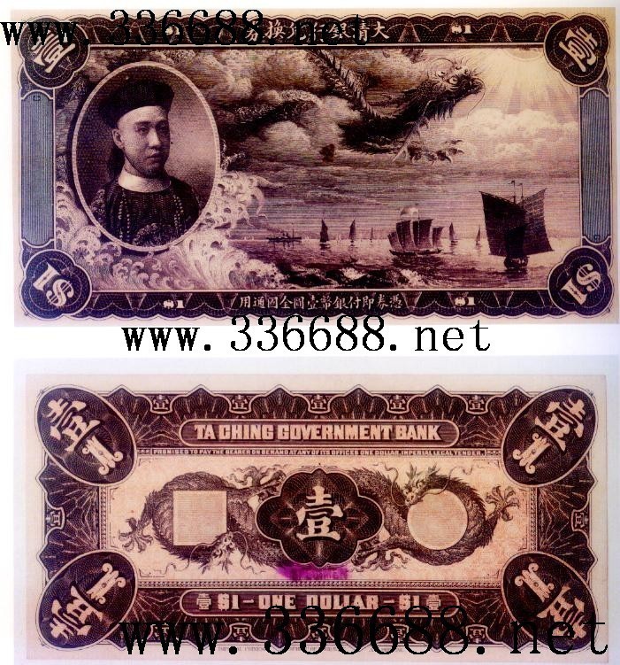宣统年间(1909年-1911年)大清银行发行全国通用的银圆兑换券一组面值壹圆、伍圆、拾圆、百圆四种、每种面值都有不同的试色票、票面左边人为摄政王、右上为日照飞龙图