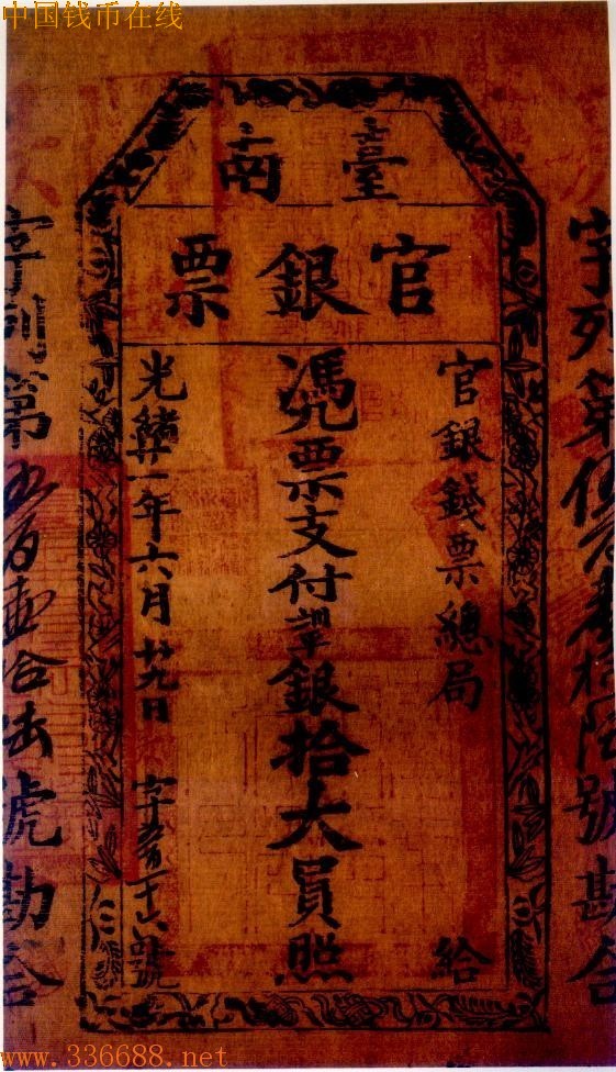 ·光绪20年(1984年)中日甲午战争,中国战败.光绪21年(1895年)签订马关条约,割让台湾给日本,台湾人民不愿受异族统治,纷纷奋勇抵抗,并组成「台湾民主国」.在抗日期间,台南地区因现银缺少、军款匮乏,于是设立「官银钱票总局」,发行台南官银票,面值分1大元、5大元、10大元三种.另台南知府忠满以「护理台南府正堂」名义,发行台南官银票,面值亦分1大员、5大员、10大员三种,据说是为鼓励商家捐款,充裕军饷之用.