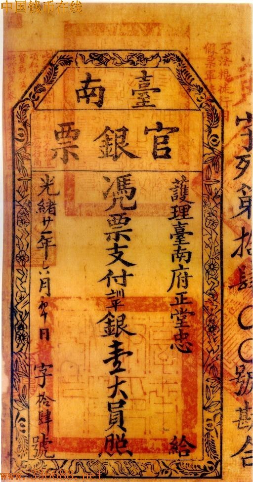·光绪20年(1984年)中日甲午战争,中国战败.光绪21年(1895年)签订马关条约,割让台湾给日本,台湾人民不愿受异族统治,纷纷奋勇抵抗,并组成「台湾民主国」.在抗日期间,台南地区因现银缺少、军款匮乏,于是设立「官银钱票总局」,发行台南官银票,面值分1大元、5大元、10大元三种.另台南知府忠满以「护理台南府正堂」名义,发行台南官银票,面值亦分1大员、5大员、10大员三种,据说是为鼓励商家捐款,充裕军饷之用.