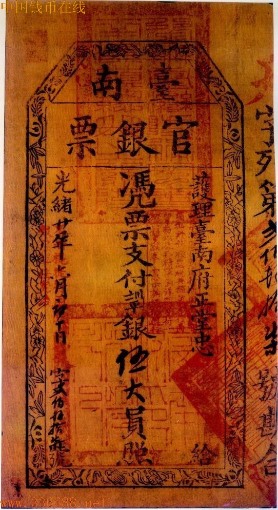 ·光绪20年(1984年)中日甲午战争,中国战败.光绪21年(1895年)签订马关条约,割让台湾给日本,台湾人民不愿受异族统治,纷纷奋勇抵抗,并组成「台湾民主国」.在抗日期间,台南地区因现银缺少、军款匮乏,于是设立「官银钱票总局」,发行台南官银票,面值分1大元、5大元、10大元三种.另台南知府忠满以「护理台南府正堂」名义,发行台南官银票,面值亦分1大员、5大员、10大员三种,据说是为鼓励商家捐款,充裕军饷之用.