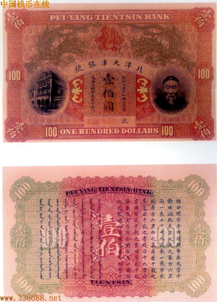 ·宣统年间,北洋天津银号委托英国Bradbury Wilkinson公司承印银两及银元票一批,银两票面值有1两、3两、5两、10两等,银元票面值有1元、3元、5元、10元、50元、100元等.其图案以「双龙抢珠」、「李鸿章像」为主.