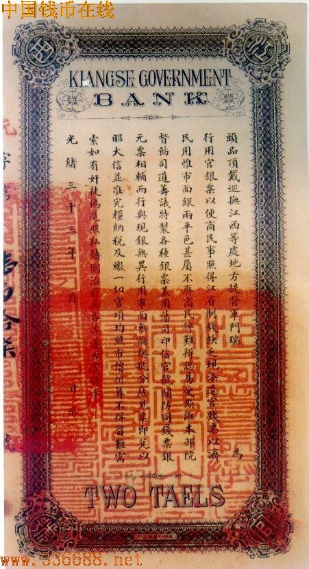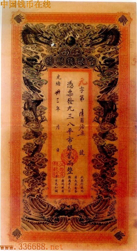 ·光绪33年(1907年)江西官银钱总号发行银两票,面值有2两、5两、10两、50两、100两.