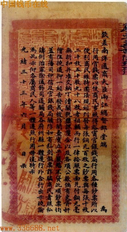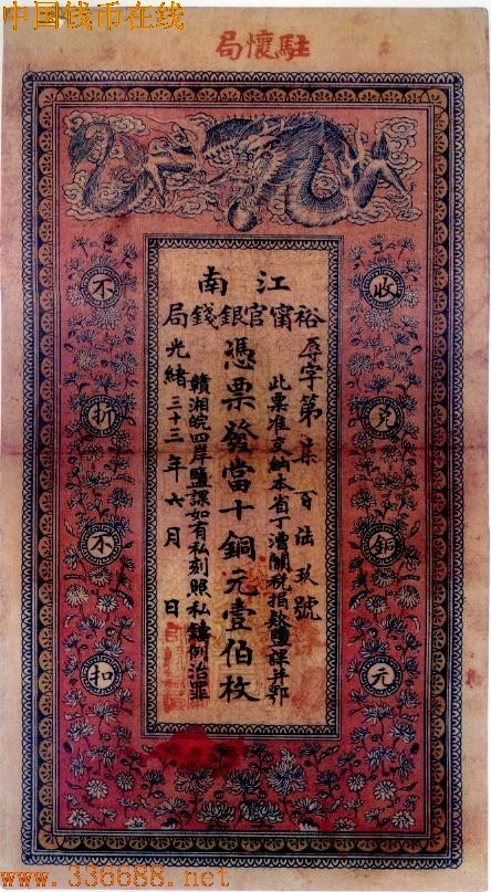 ·江南官银钱局光绪33年(1907年)当十铜圆100枚票,可通行鄂赣湘皖四岸,收兑铜圆不折不扣.