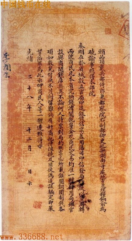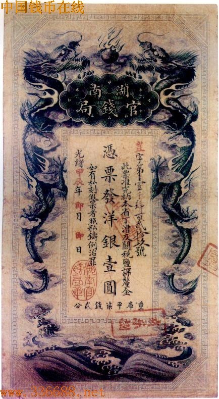 ·湖南官钱局成立于光绪29年(1903年)2月,在未成立前就向日本订印纸币一批,包括银元票1元、银两票1两、制钱票1串文,因此在纸币的正面上,年度原是空白,后加盖「甲辰」,背面上的告示是光绪28年.