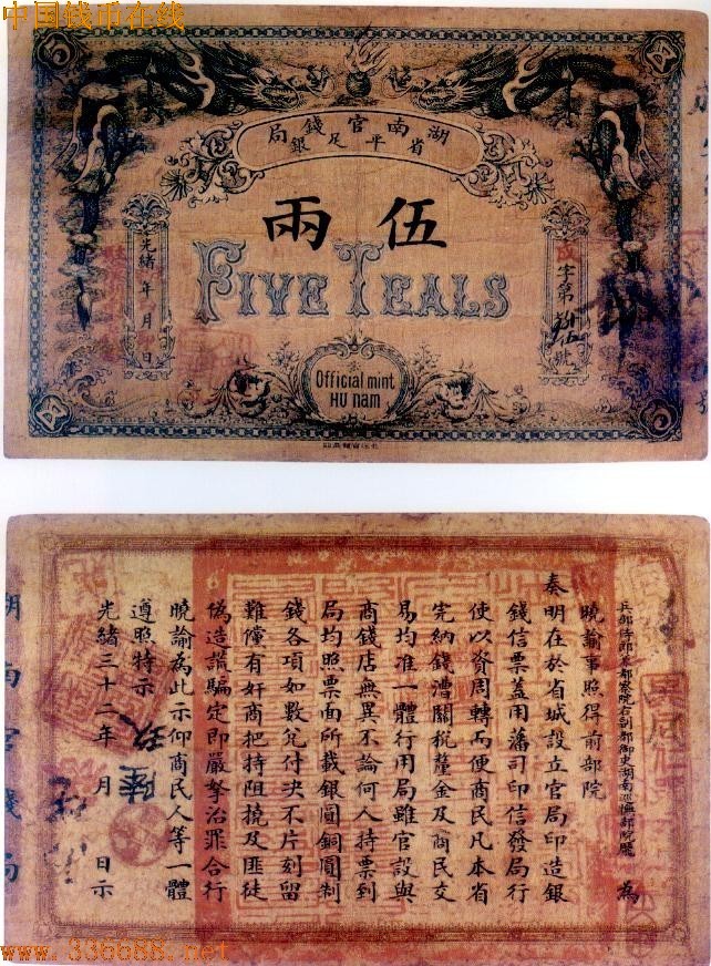 ·光绪32年(1906年),湖南官钱局发行5两银两票,系由北洋官报局印.票面加盖年度,计有丙午、丁未、戊申等.此票俗称第一版银两票.