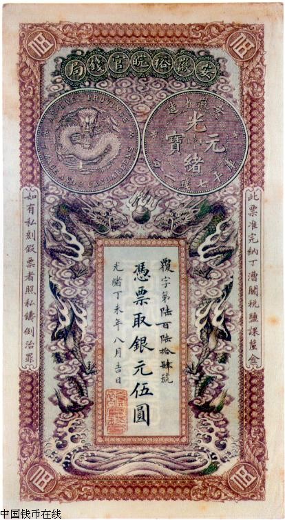 ·光绪33年(1907年),安徽裕皖官钱局发行银元票,分1元(横式)、5元(直式)两种,系上海商务印书馆承印.