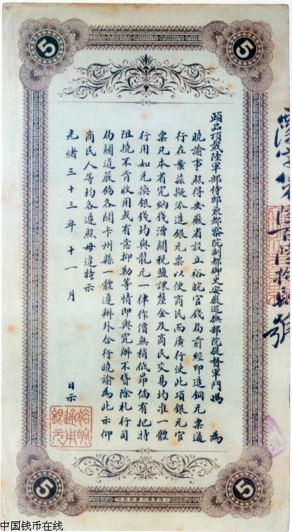 [组图]光绪33年安徽裕皖官钱局   5元         ★★★