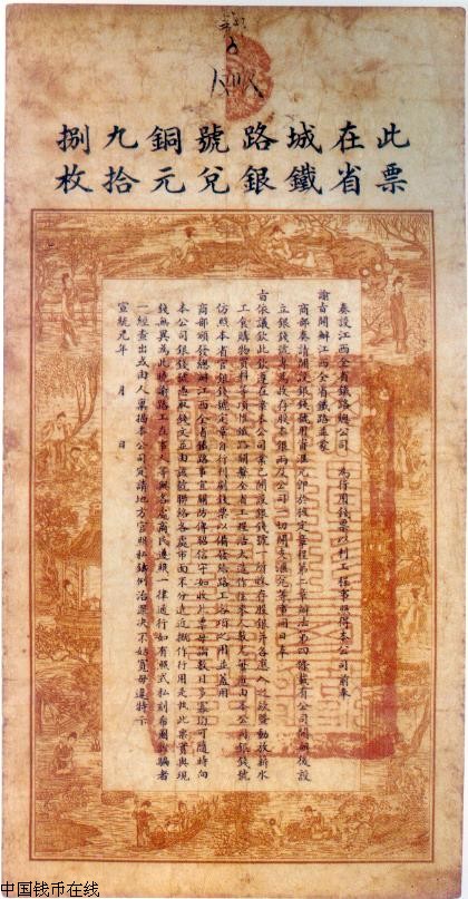 ·自强运动又名洋务运动,兴办铁路是其中一项,李鸿章认为可以「巩固国防」,张之洞认为可以「裕国便民」.于是各省先后兴办铁路.此票为「江西铁路银钱号」在宣统元年(1909年)发行的「当十铜元100枚」票.