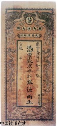 ·流通在京津地区的银元票,由「银号」发行,其图案以「龙凤」为主.已雕具新式银行的型式 .