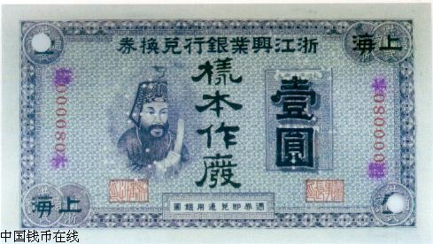 ·光绪31年(1905年),又杭州、宁波、绍兴一带富商聚资创办「浙江兴业银行」,光绪33年(1907)奉准发行纸币,面值分1元、5元、10元三种.纸币图案1元为王杨明,5元为管仲,10元为齐太公,票背皆是「公鸡报晓」图.
