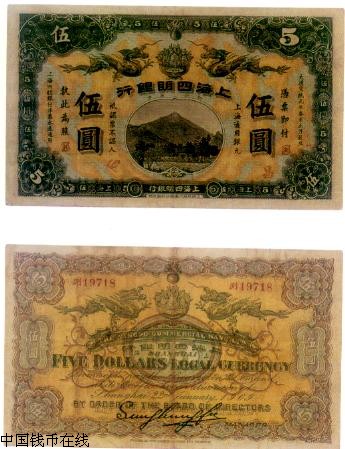·光绪34年(1908年)8月,浙江宁波仕绅聚资创办「四明银行」,宣统元年(1909年),清政府度支部批准发行银元票,分1元、2元、5元、10元四种.票面中央为「四明山景」.票面、票背上端均有双龙迎向「聚宝盆」图,版式可分「上海商务印书馆」及「上海集成公司」二种.