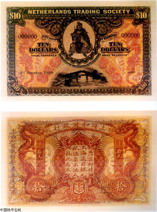 ·和谰银行成立于清道光4年(1824年),总行设于荷兰首都阿姆斯特丹.宣统元年(1909年)上海分行发行银元票1元、5元、10元三种.