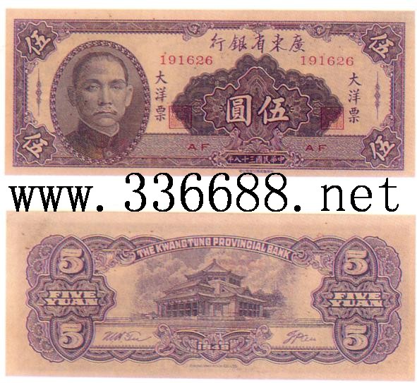 [图文]广东省银行民国38年(1949)大洋票     5元         ★★★