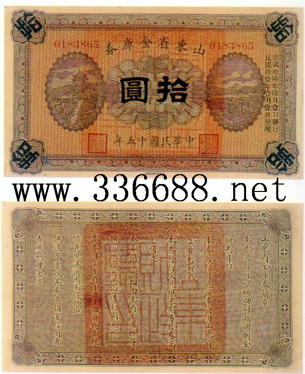 [图文]山东省银行民国16年(1927)金库券   10元         ★★★