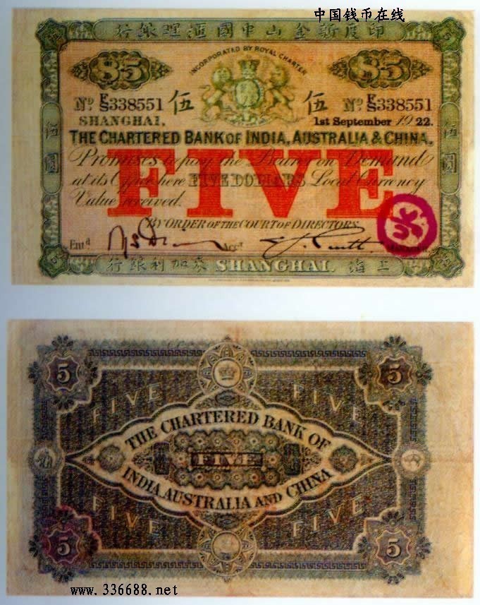 [图文]1922年印度新金山中国汇理银行麦加利银行   5元         ★★★
