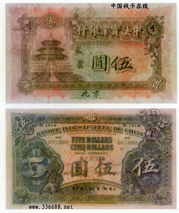 1914年中法实业银行   5元