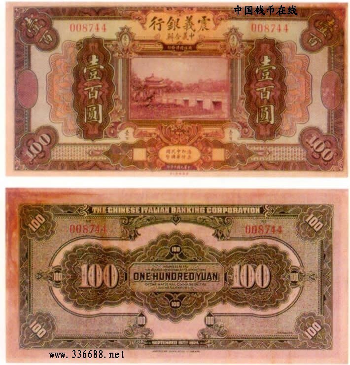 普通洋行客钞纸币[震义银行][图文]1921年震义银行   100元刘扬01-17