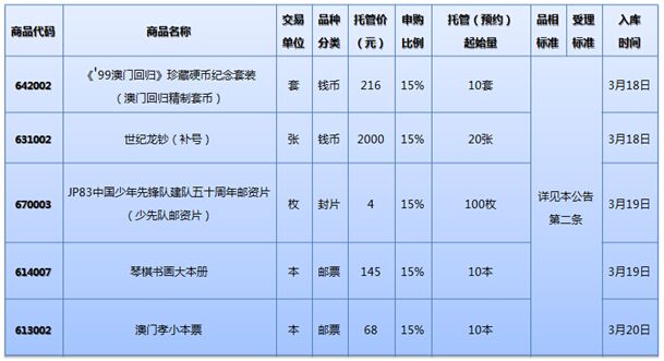 《澳门回归精致套币》、《琴棋书画大本册》、《澳门孝小本票》为鉴评商品数量×托管价×1%